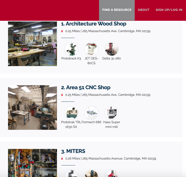 The Mobius web portal gave students the ability to search Project Manus’s database based on machine type, materials needed, and machine capabilities. An interactive map function made it easy for students to use their location to find facilities nearest to them. Facility managers use their own dashboard to maintain information on availability of equipment, which updates automatically to the app. If there was a need for facilities or machines outside of the MIT campus, the app was also able to search globally for available resources.
