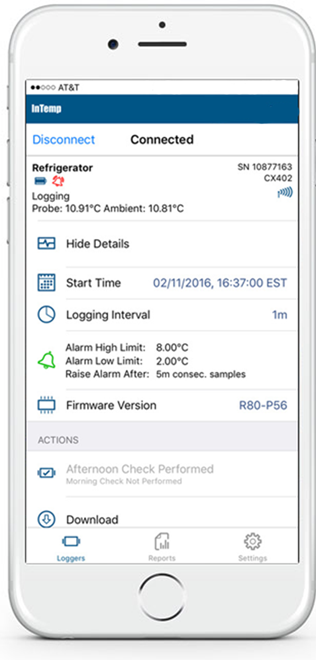In addition to the automatic data uploading and storage features, InTemp data loggers check temperature alarms on refrigerators, freezers, and transit packages. If a temperature excursion is detected, the InTempConnect app dispatches an alert to users via text and/or email so critical product disposition decisions can be made quickly, reducing and preventing product loss.